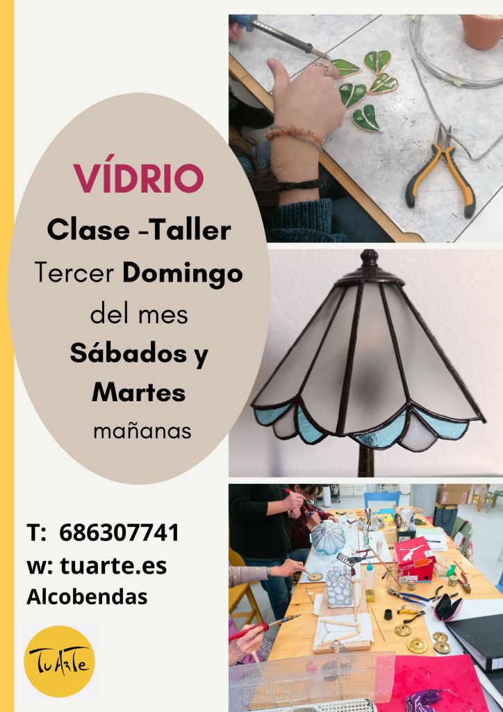 Taller de vidrio, técnica Tiffany: Martes de 11 a 14h más Tercer domingo de cada mes y los Sábados. Curso monográfico, haz tu propio proyecto, 120€ al mes por 4 clases, 70€ al mes por dos clases. Taller inicial / clase suelta 56€ todo incluido. Si tienes interés dínoslo.