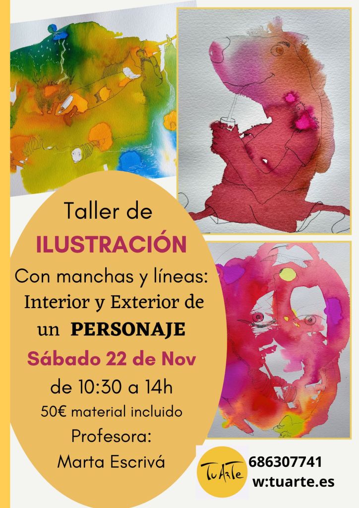 Taller de Ilustración: Tercer domingo de cada mes de 10:30 a 14h y Sábado 31 de Enero Con manchas y líneas, creamos el interior y exterior de un PERSONAJE (ver cartel). El precio de la sesión, todo incluido es 50€.